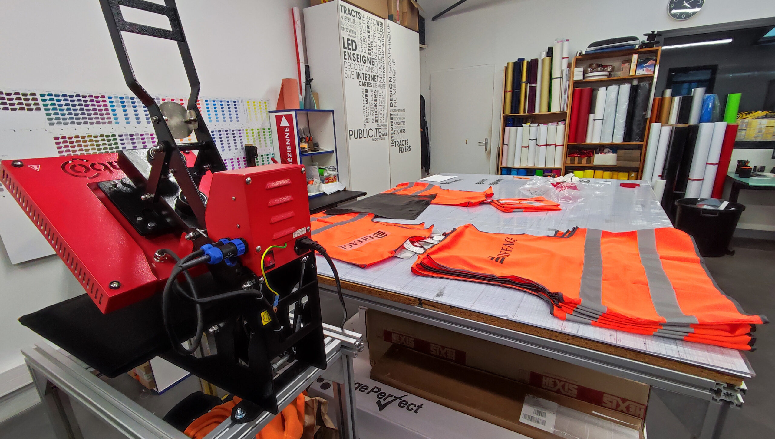 Pour répondre à cette demande récurrente de nos clients, on s’est équipé d’une super presse à transfert textile. ça chauffe bien comme il faut, ça presse fort… et ça personnalise tous vos vêtements pro. Pour presser du « flex » imprimé et/ou découpé sur nos machines ou des impressions DTF en provenance de nos fournisseurs préférés, cette machine répond parfaitement à la production de petites et moyennes séries de personnalisation de vêtements.